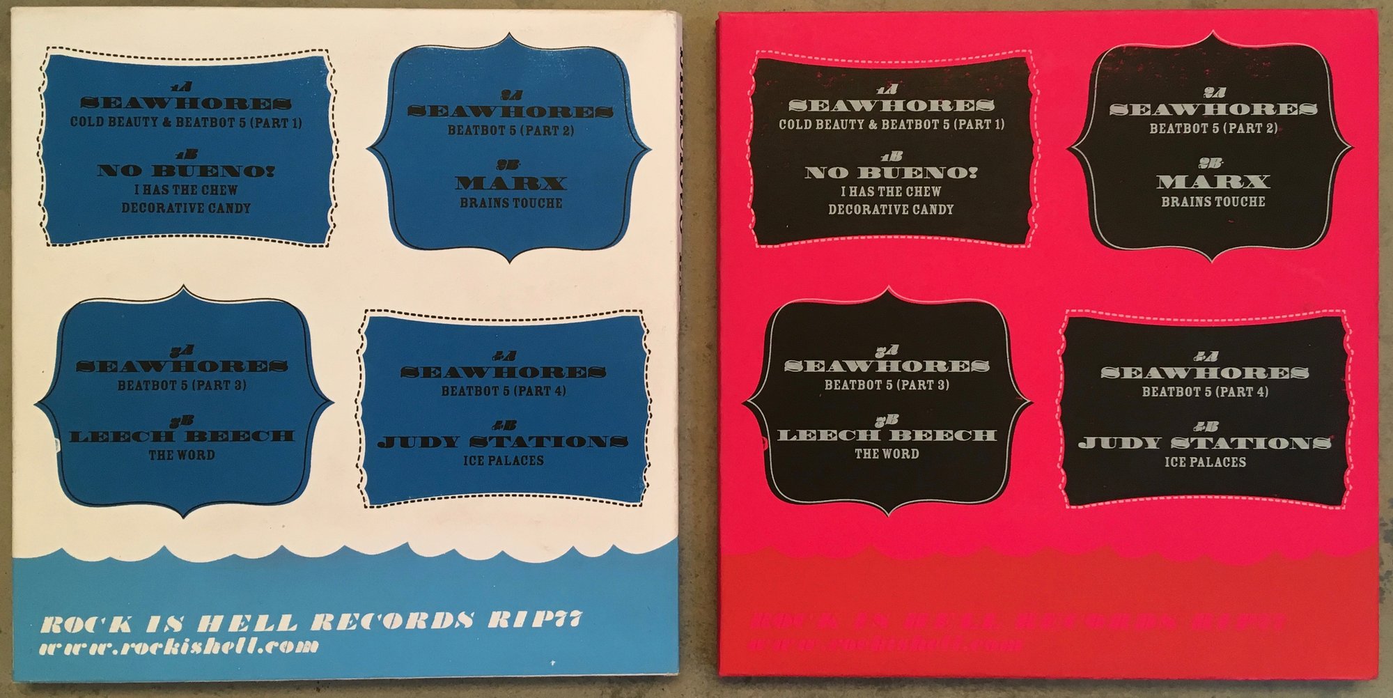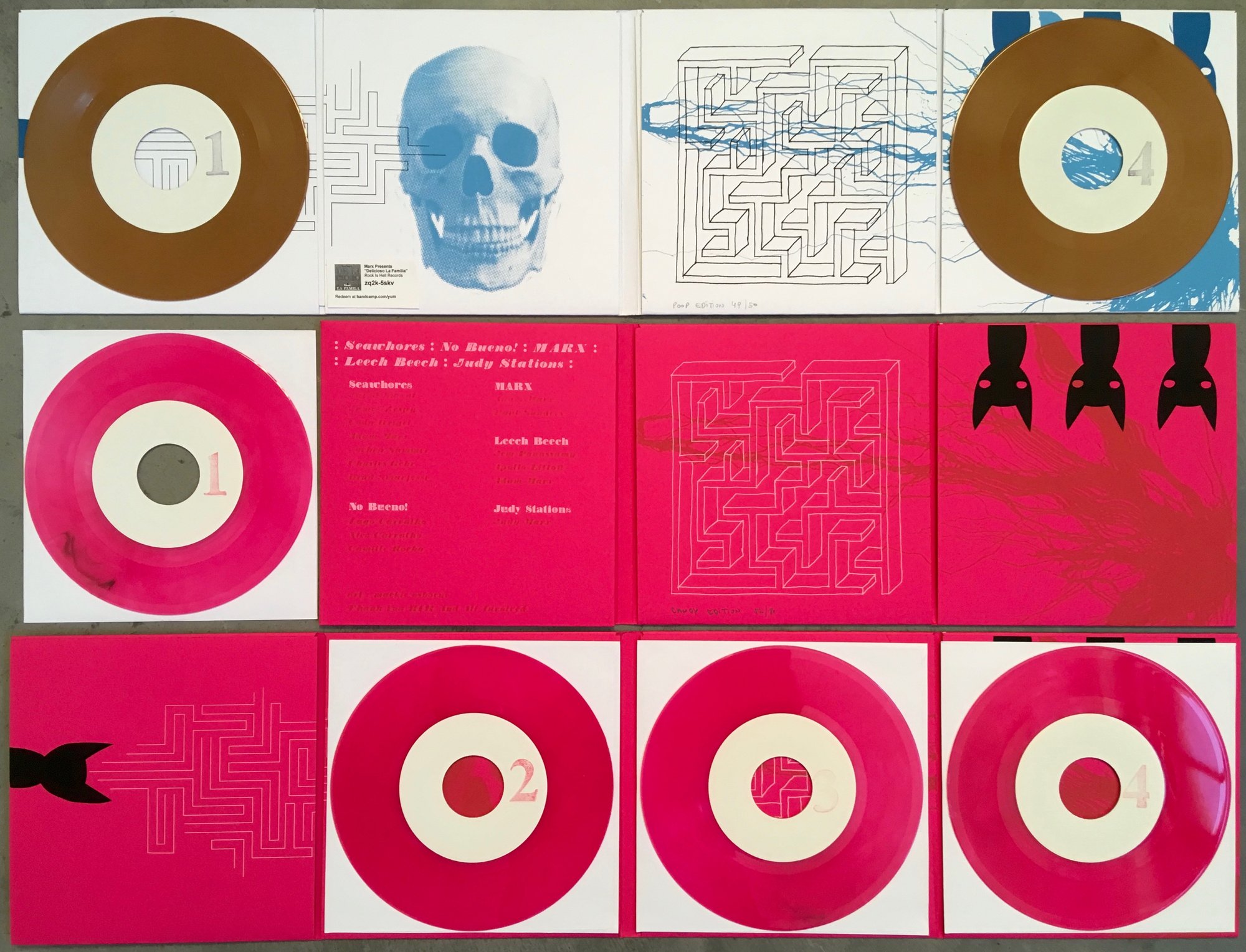 4 x 7" vinyl records featuring: Seawhores, MARX, Leech Beech (Paul Erickson/Hammerhead, Jem Ponussamy/DEAD, Adam Marx), Judy Stations, No Bueno... Art by Mackie Osborne. Pink copies have pink vinyl. White copies have "poop" colored vinyl. Black sold out in pre-order. This is the first compilation of many that include a wide variety of projects and people that I'm more than proud to be involved with. Rock Is Hell Records of Austria is the label.